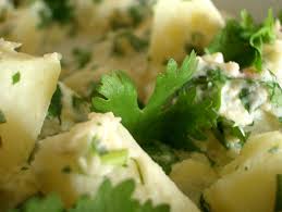 Tagliate le patate a cubetti e trasferitele in una grande ciotola; irroratele con la salsa alle olive preparata, mescolate delicatamente con due cucchiai di legno e servite.